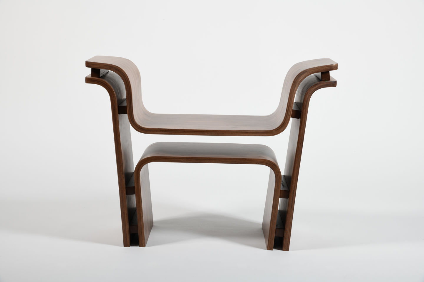 Exploring the basic function and design of furniture as it relates to human factors, such as anthropometrics and ergonomics. This chair was fabricated using four layers of moulded plywood with Walnut Crown wood veneer finishing. The design of the chair uses planar curves in order to maximize the potential of bendy plywood. It consists of four pieces, two horizontal pieces (the seat and a shelf), that are held together by two perpendicular pieces (the legs), all is held by eight solid wood spacers. Creating a floating lightweight illusion juxtaposed with its heavy weight construction materials in a manner that each piece relies on the other for stability, blurring the boundaries between weightlessness and solidity.
